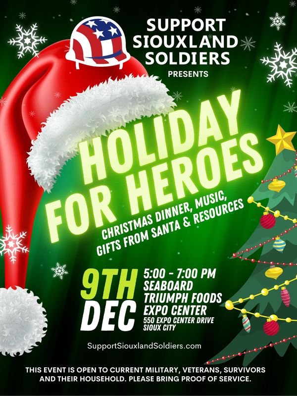 Holidays for Heroes is a free holiday event for all who served, Military families and Surviving families. It includes a holiday dinner, music, and gifts from Santa and his elves. Follow our Facebook for more details. https://www.facebook.com/SupportSiouxlandSoldiers